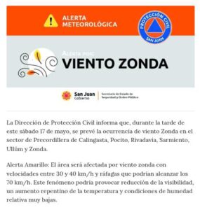 La Dirección de Protección Civil de la provincia de San Juan emitió una alerta meteorológica amarilla por la probabilidad de viento Zonda durante la tarde del sábado 17 de mayo. El fenómeno afectaría principalmente a los departamentos ubicados en la Precordillera de Calingasta, Pocito, Rivadavia, Sarmiento, Ullum y Zonda.