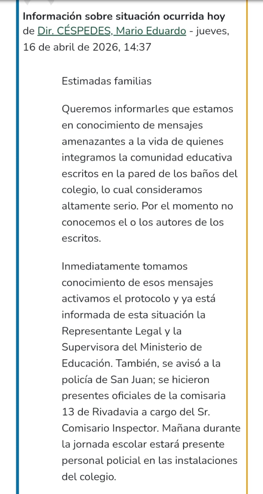 A través de una comunicación oficial dirigida a las familias, el equipo directivo informó que tomó conocimiento de los escritos intimidatorios y los calificó como un hecho “altamente serio”. En ese sentido, indicaron que, por el momento, no se logró identificar a los autores de los mensajes.