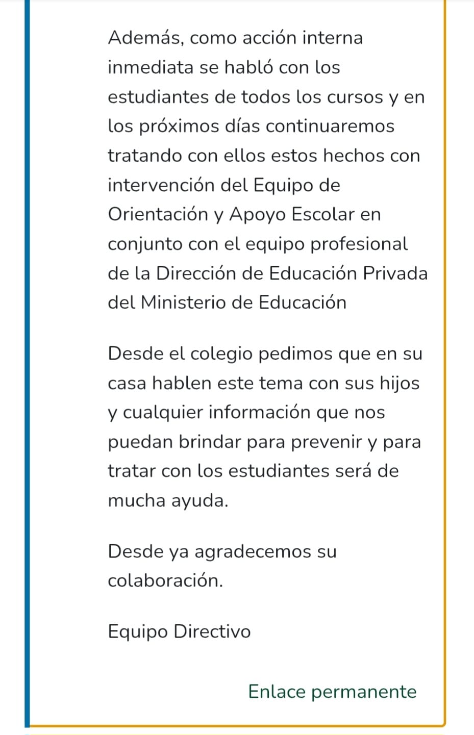 Además, desde la institución explicaron que comenzaron a abordar la situación con estudiantes de todos los cursos, mediante la intervención del Equipo de Orientación y Apoyo Escolar, junto a profesionales de la Dirección de Educación Privada.
