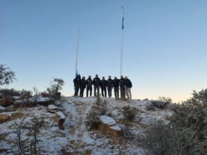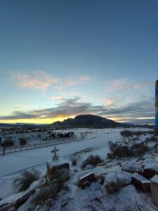 Desde bien temprano, la nieve se apoderó de los caminos, cerros y senderos del parque, cubriendo incluso la cartelería y los ingresos al predio. Las primeras luces del amanecer reflejaban tonos dorados sobre la superficie nevada, generando una atmósfera mágica en pleno corazón del Valle Fértil.