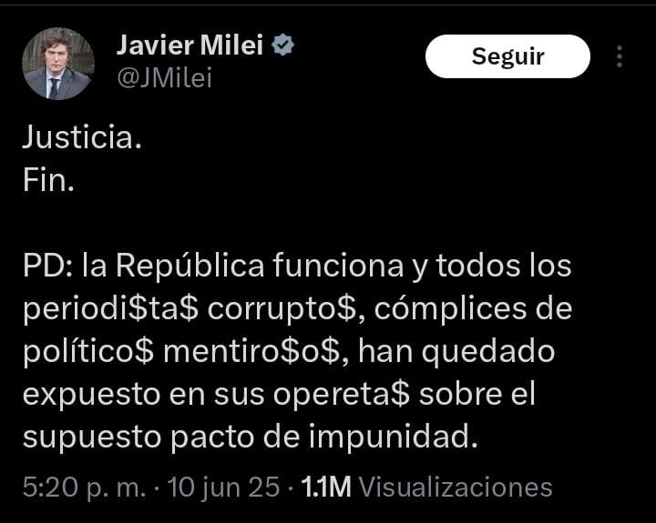 Además, el presidente arremetió contra parte del periodismo, al que acusó de haber instalado versiones falsas sobre un supuesto acuerdo secreto con el kirchnerismo. “La República está en marcha y quedaron al descubierto todos esos periodistas venales y políticos embusteros que difundieron operetas sobre un arreglo para garantizar impunidad”, lanzó Milei en un mensaje cargado de críticas.