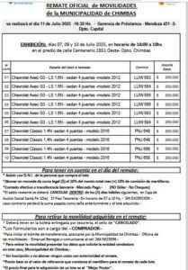 Los interesados podrán obtener más información sobre los requisitos, condiciones de la subasta y características técnicas de los vehículos en las oficinas municipales o a través de los canales oficiales de la Municipalidad de Chimbas y de la Caja de Acción Social.