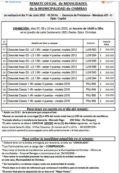 La Municipalidad de Chimbas anunció que realizará un remate oficial de vehículos en conjunto con la Caja de Acción Social. La subasta se llevará a cabo el próximo 11 de julio a las 16:30 en la sede de la Gerencia de Préstamos de la Caja, como parte de un proceso de reorganización y optimización del parque automotor municipal.