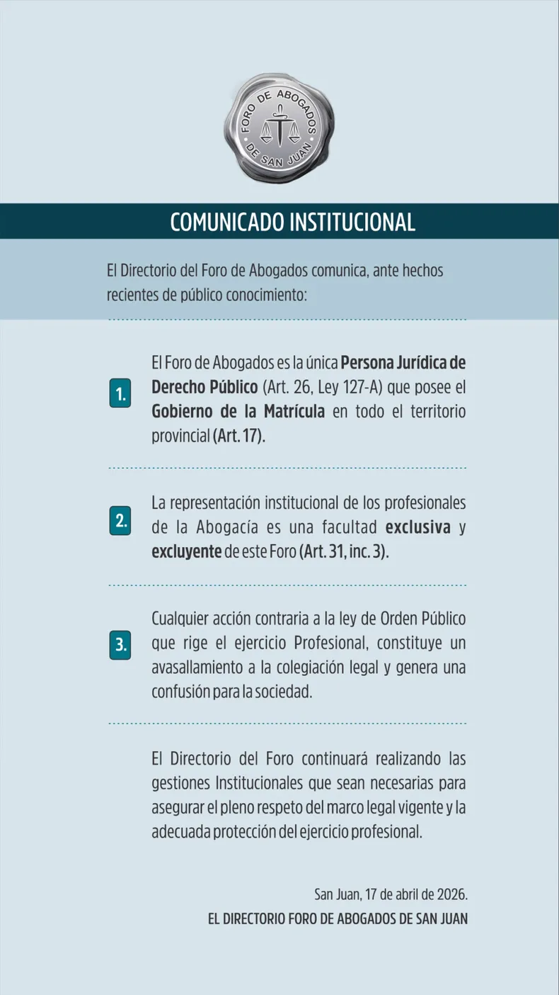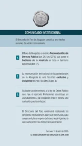 La disputa dentro del Foro de Abogados sumó un nuevo capítulo y dejó en evidencia una creciente tensión institucional. Tras el pedido de remoción de integrantes del Directorio vinculados a Abogacía Transformadora, la entidad salió con un comunicado firme en el que reafirmó su carácter como única organización con potestad legal para representar a los profesionales del derecho en la provincia.