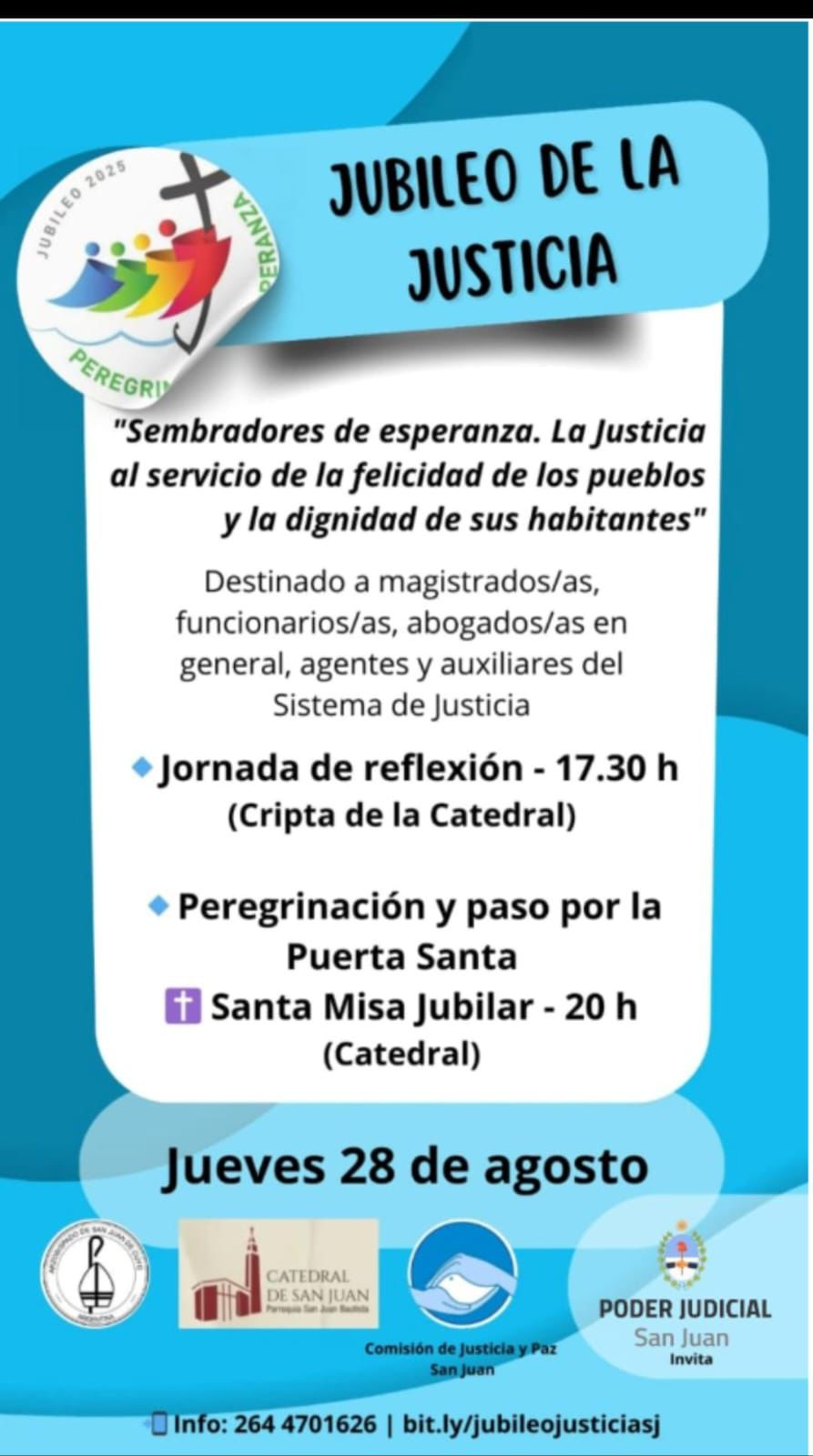 Bajo el lema “Sembradores de esperanza. La Justicia al servicio de la felicidad de los pueblos y la dignidad de sus habitantes”, este jueves 28 de agosto se celebrará el Jubileo de la Justicia, una propuesta espiritual y comunitaria destinada a todos los integrantes del Poder Judicial y del sistema de justicia.