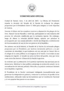 La respuesta del gobierno nacional por la derrota en el Senado Publicado por Redacción | 3 abril, 2025 Compartir:Desde casa rosada emitieron un comunicado durísimo, que cuestiona la votación de hace instantes dándole uno de los resultados en contra al ejecutivo de los que no se tiene registro alguno en el pasado. Mirá la respuesta de MILEI: Compartir:
