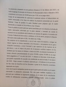 Como nueva propuesta, el Gobierno ofreció una suma fija de $100.000, a pagar en dos cuotas: la primera en el primer fin de semana de abril y la segunda a fin de mes. Además, anunció que no descontará el día de paro del 5 de marzo, un gesto que fue bien recibido por los gremios.
