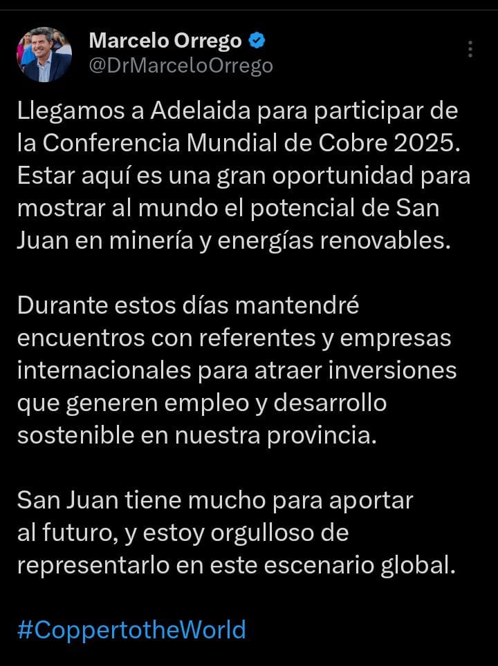 El gobernador de San Juan, Marcelo Orrego, expresó su satisfacción tras participar como orador en la Conferencia Mundial de Cobre 2025, que se desarrolla en la ciudad de Adelaida, Australia, y reúne a los principales referentes de la minería internacional.