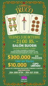 Este viernes 3 de octubre, el Salón SUOEM (General Paz 955 oeste, Ciudad) se transformará en el escenario de una noche donde la habilidad en las cartas se combinará con la solidaridad. La UDA Newcom San Juan organiza su Primer Torneo de Truco, un evento que busca juntar diversión, competencia y apoyo a los deportistas locales.