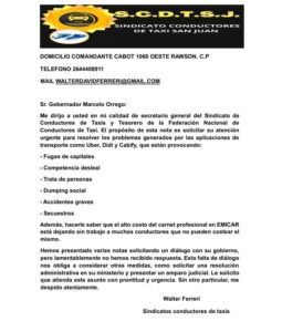 La nota finaliza con un pedido directo al gobernador Orrego para que “atienda este asunto con urgencia”, en defensa de la actividad de los taxistas sanjuaninos.