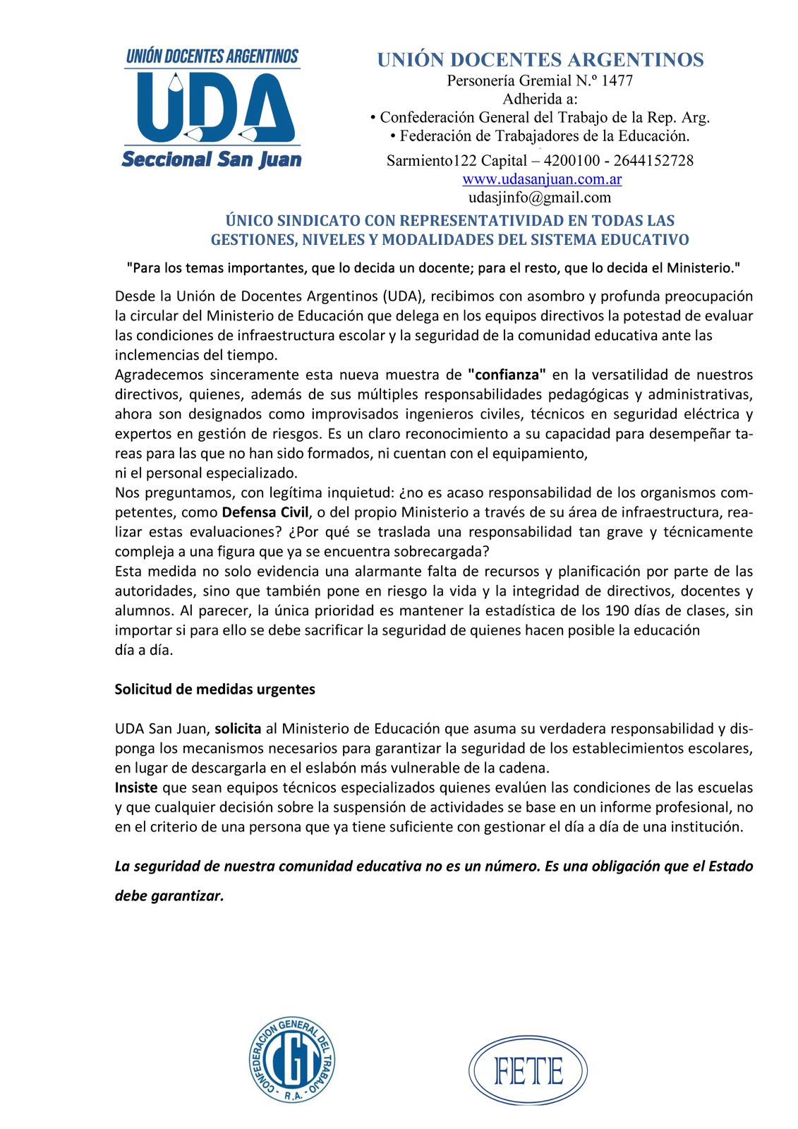 “La seguridad de nuestra comunidad educativa no es un número. Es una obligación que el Estado debe garantizar”, concluyó el escrito difundido por UDA San Juan.