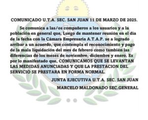 En consecuencia, el gremio anunció con satisfacción que la medida de fuerza prevista para el miércoles 12 de marzo a partir de las 00:00 horas queda oficialmente levantada.