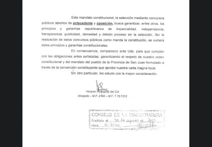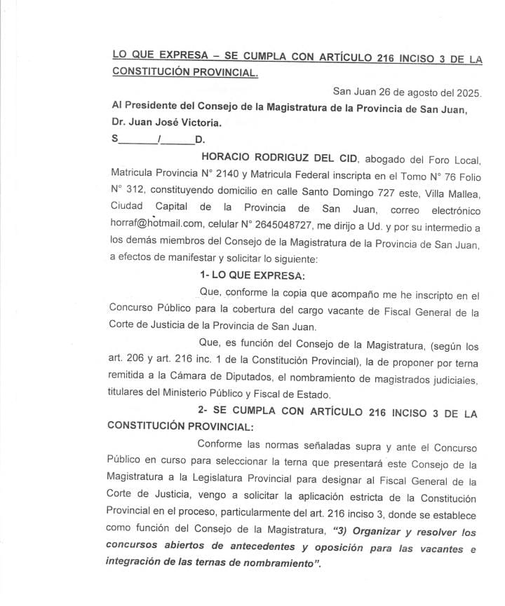 El abogado sanjuanino Horacio Rodríguez del Cid presentó un escrito formal ante el Consejo de la Magistratura para exigir el cumplimiento del artículo 216, inciso 3, de la Constitución Provincial, que establece la obligación de organizar concursos públicos de antecedentes y oposición para la selección de magistrados, fiscales y fiscales de Estado.
