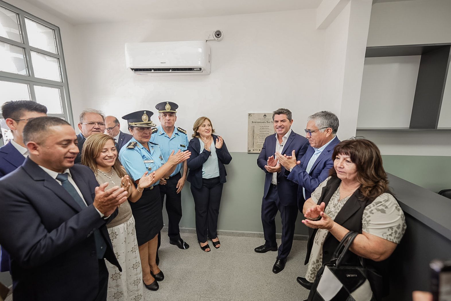 La inauguración del edificio se llevó a cabo con el acompañamiento del gobernador Marcelo Orrego, junto a autoridades provinciales y departamentales, en un acto que marcó la puesta en funcionamiento formal de la nueva sede policial.